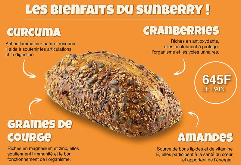 A L’Atelier Gourmand, nous aimons allier plaisir et nutrition. Notre pain Sunberry au curcuma est un concentré d’ingrédients soigneusement sélectionnés pour leurs qualités gustatives et leurs bienfaits.